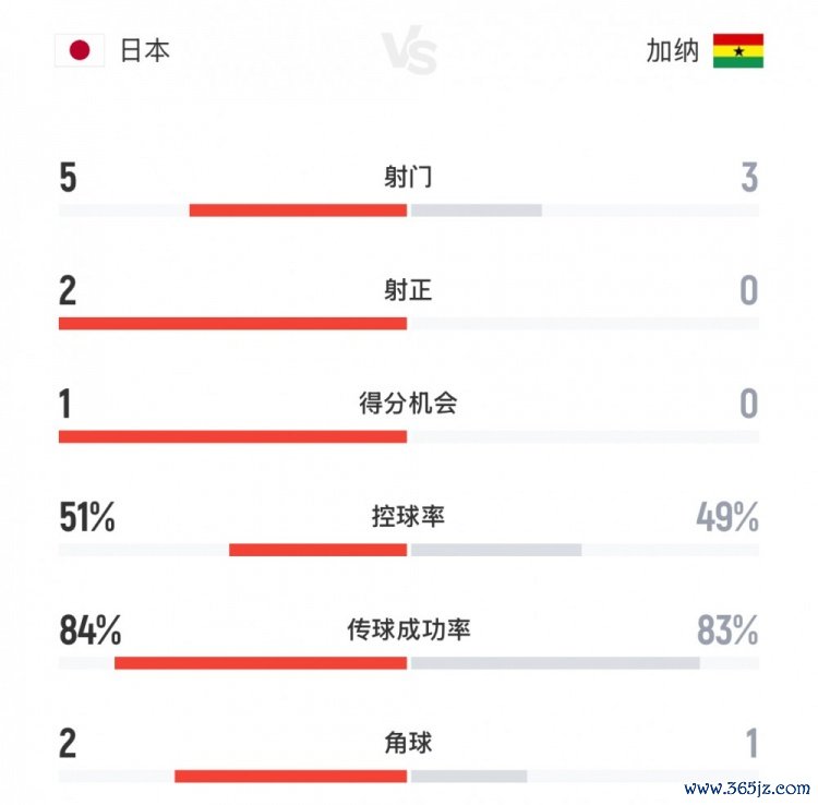 日本vs加纳半场数据:射球 5-3,射正2-0,盘带时间