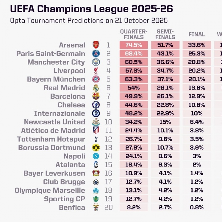 10月21日讯 欧冠职业联赛 阶段第三轮开赛在即,opta超级计算机更新了欧冠夺魁 概率,苏超直播其中阿森纳位列榜首,巴黎、曼城分列二三。