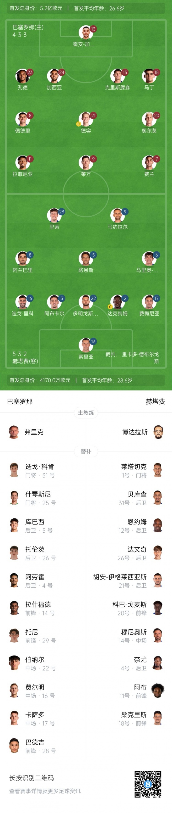 巴萨杆位:13-霍安·加西亚、24-埃里克·加西亚、15-克里斯滕森、18-赫拉德·马丁、23-孔德、8-佩德里、20-奥尔莫、21-德容、7-费兰、11-拉菲尼亚、9-莱万