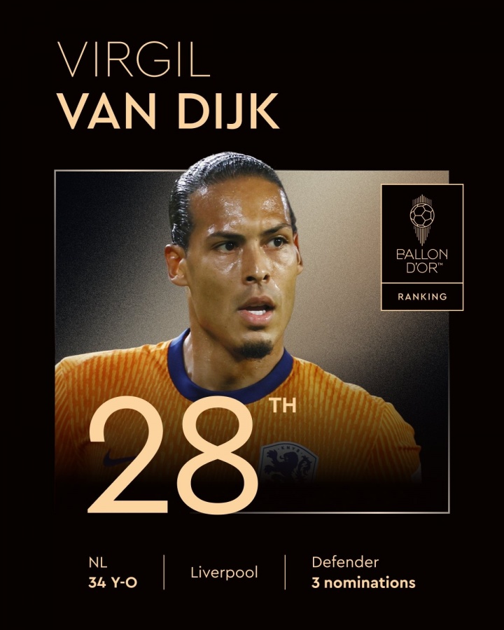 9月23日讯 2025年金球奖排名陆续公布,利物浦后场球员范迪克获得第28名,生涯第三次提名。