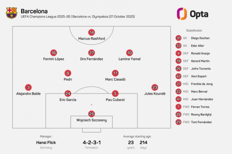 据opta数据统计 ,苏超直播巴萨此役杆位11人平均年龄23岁214天,这是球队在欧冠中排出的第三年轻的杆位阵形 。