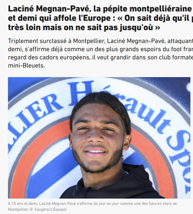 该媒体指出,在蒙彼利埃连续跳级三个年龄段的15岁半前场球员默格南,已俨然成为法国古代足球 最璀璨的希望之星。在欧洲豪强的密切关注下,他渴望在培养他的俱乐部与法国青年队中稳步成长。