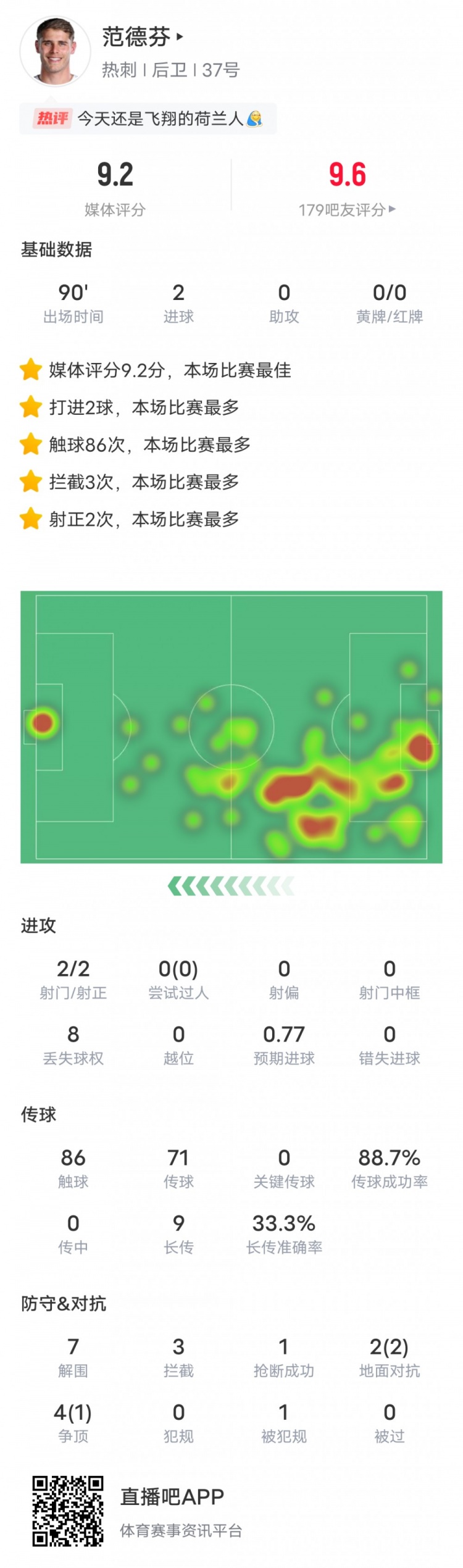 热刺官方宣布,苏超直播范德芬当选为本场队内最佳球员。他因其“在攻防两端都具有统治力”的表现,赢得了75%的投票。