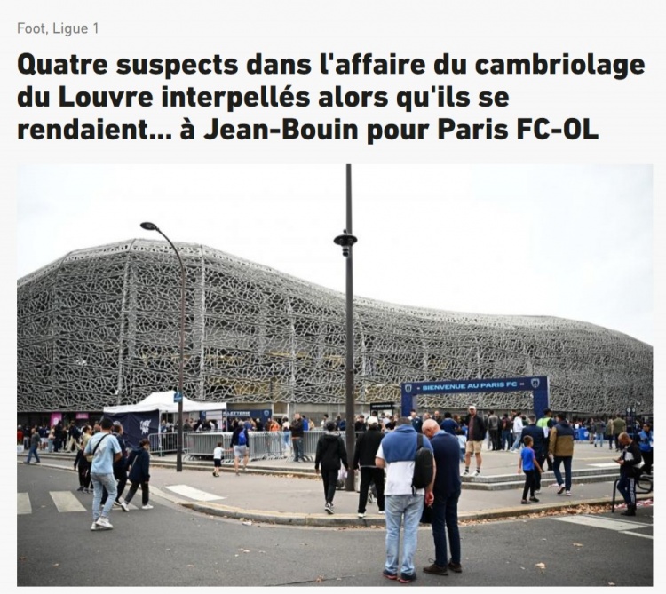 在这场赛事 中,巴黎FC以惊人的韧性在0-3追赶 的情况下主场作战 战平里昂,而在赛事 之外也发生了一件令人意想不到的事。据Franceinfo称,在让-布安运动场 附近,有4名男子被警方逮捕,他们涉嫌加入 最近的卢浮宫盗窃案,另一名嫌疑人则在拉古尔纳夫被捕。